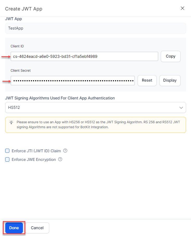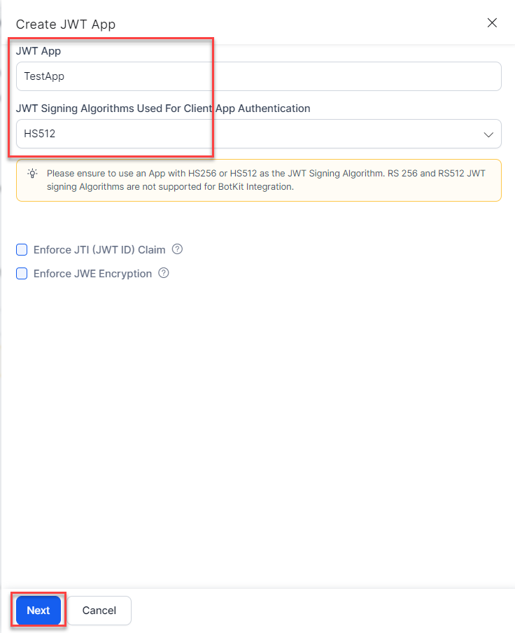 - From the JWT Signing Algorithms Used For Client App Authentication dropdown, select a signing algorithm (preferably HS256 or HS512) and then click Next.