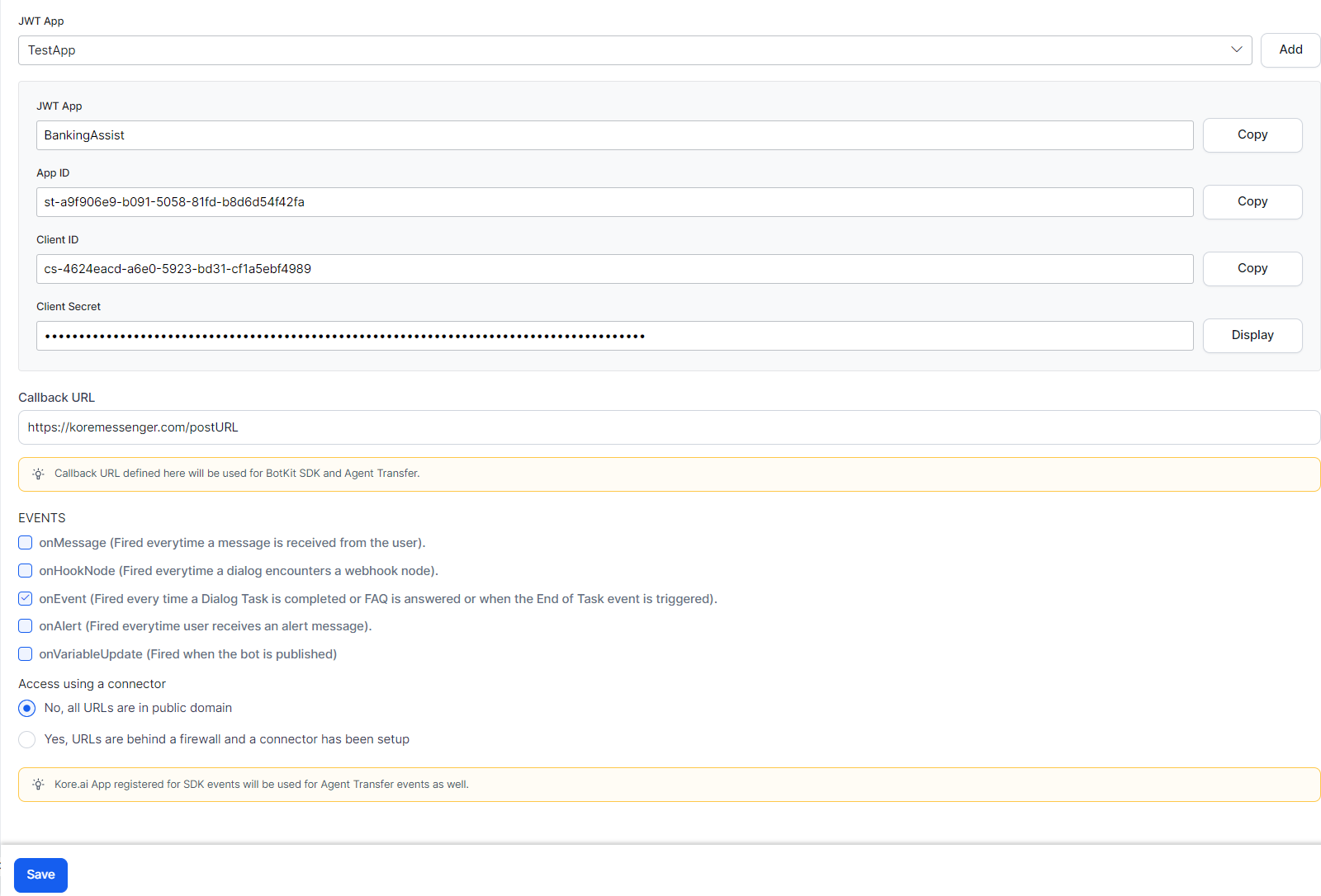 To enable your Platform bots to communicate between your application servers and the Platform servers, you need to create and register an app in the Platform App Builder that specifies the callback URL for your application and generates the Client ID and the Client Secret authentication tokens required for secure communications between your application and any Bots in your developer account.
