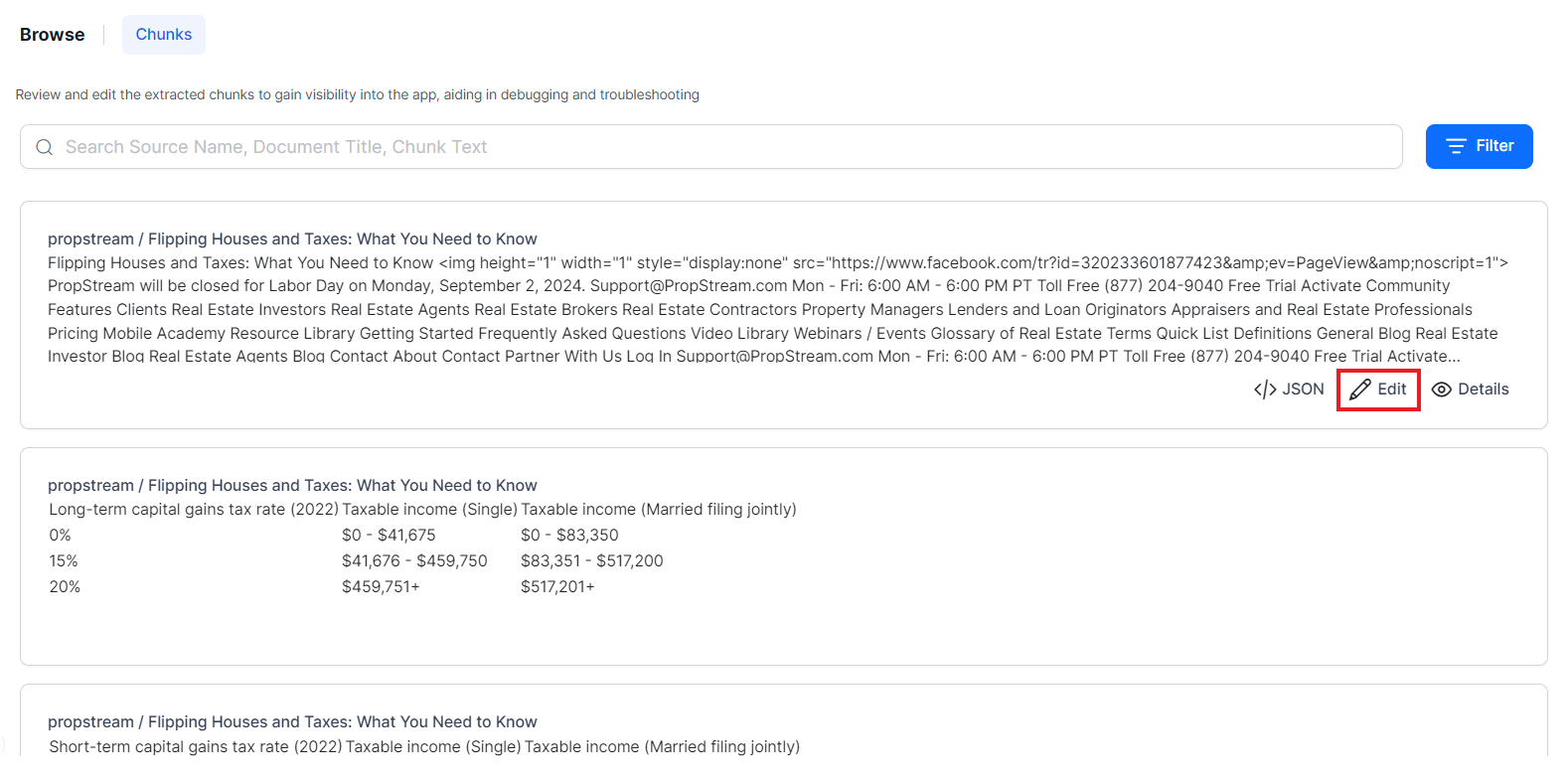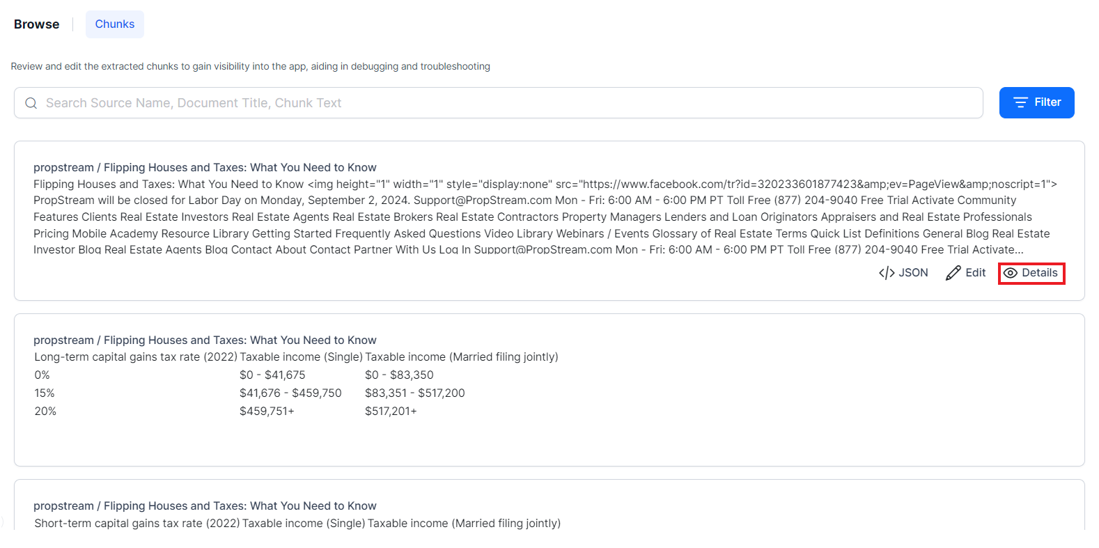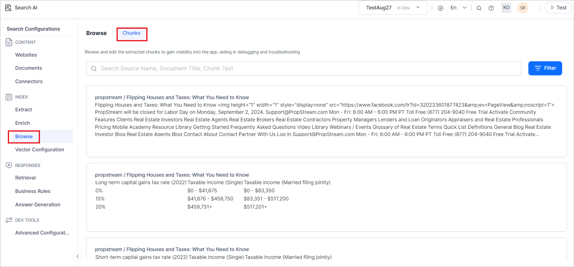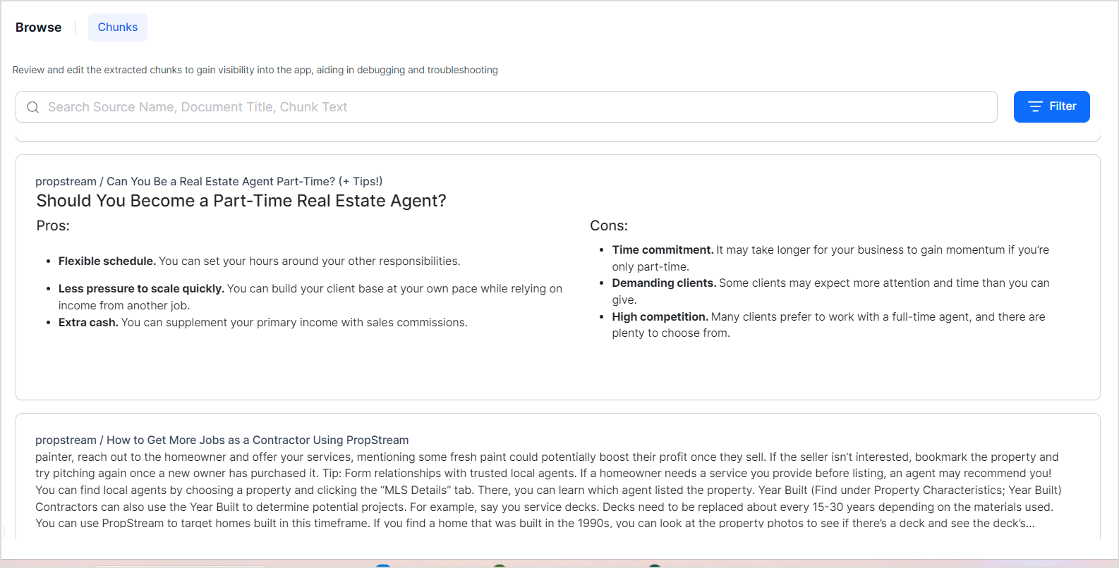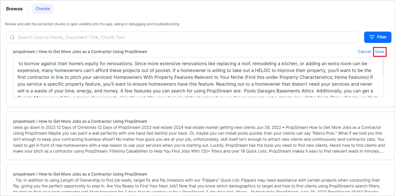 You can also use the chunk browser to search for specific chunks using any of the properties of the chunks like chunkTitle, chunkText, source, etc. Use the search bar at the top to search for chunks.