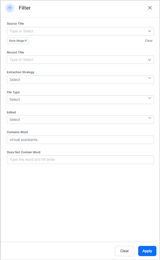 The Filter option offers you an advanced search capability that can be used to find chunks based on various chunk properties like source types, extraction strategy, content, etc. You can use one or more of these fields to find the corresponding chunks. For example, to search for all the chunks from a particular content source, “Kore blogs”, containing the words “virtual assistant”, you can set up a filter as shown below.