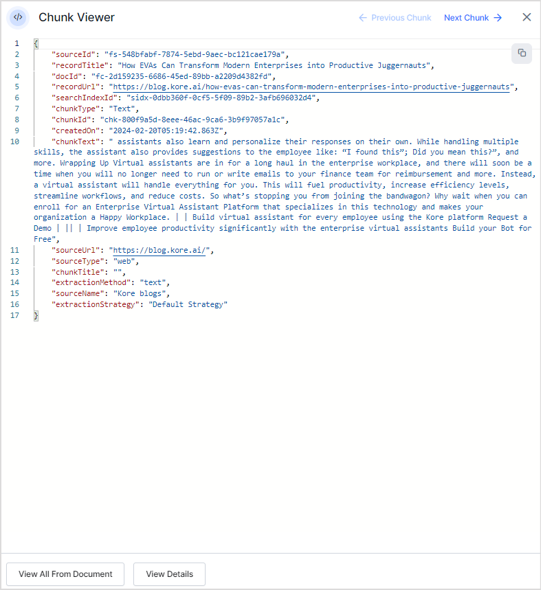 The Chunk Viewer also allows you to edit and update the title and text of the chunk. This gives you the ability to enhance the chunk for effective answers.