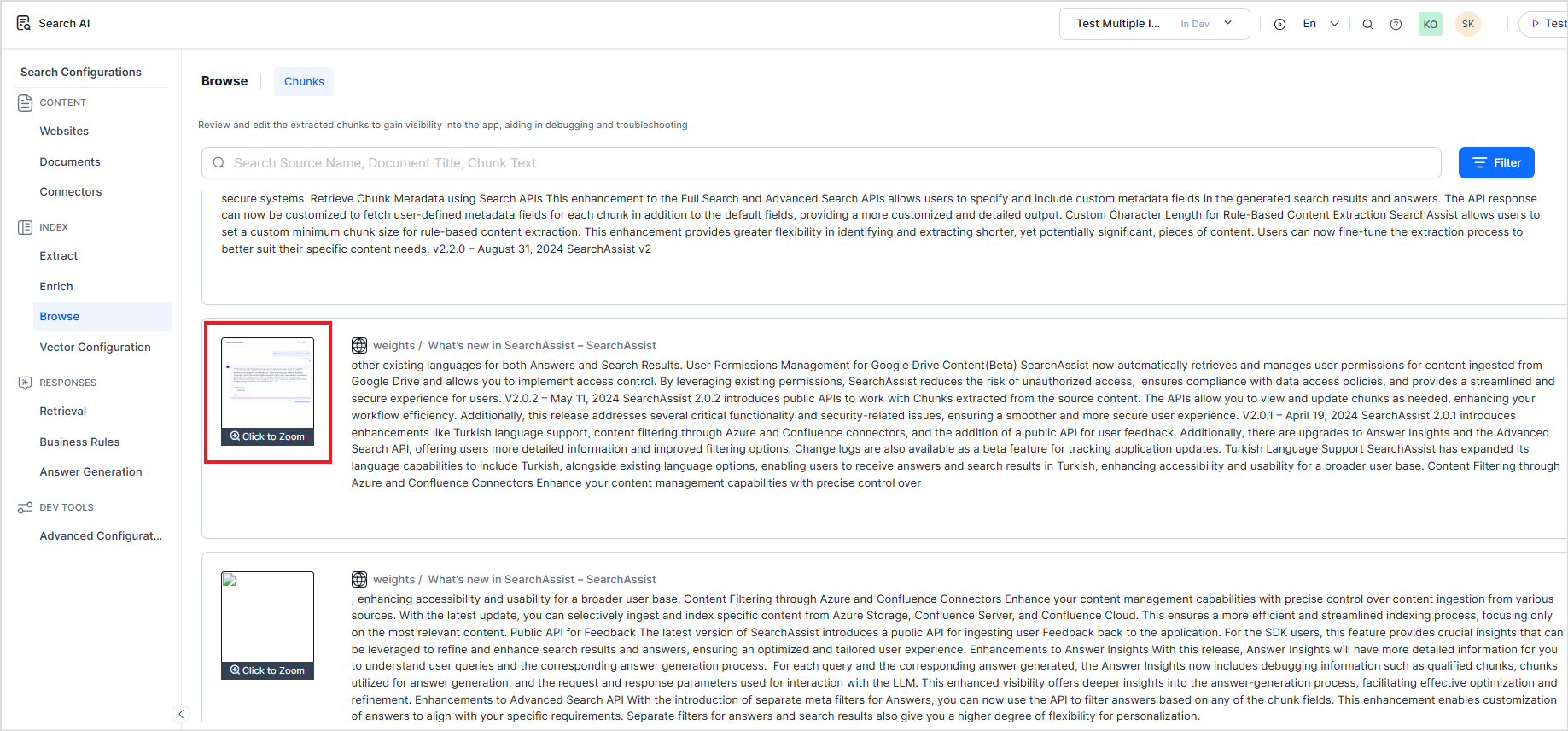 Go to the Browse section under the Index tab to view the chunks. The chunks browser displays chunks from all the data ingested into the application.