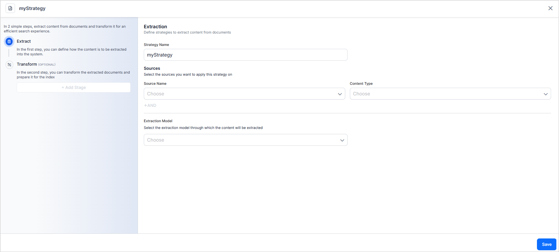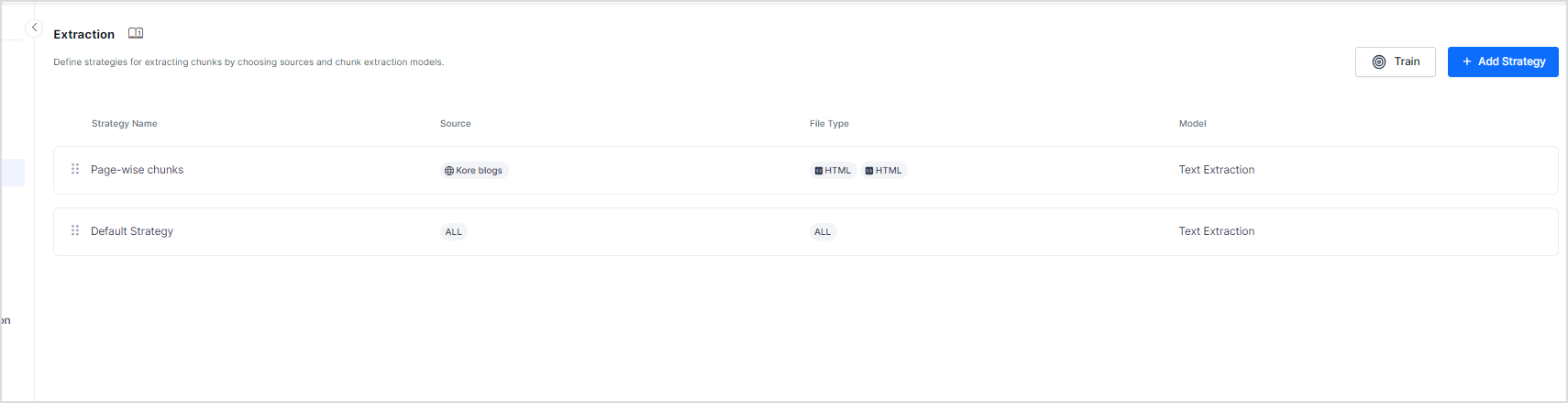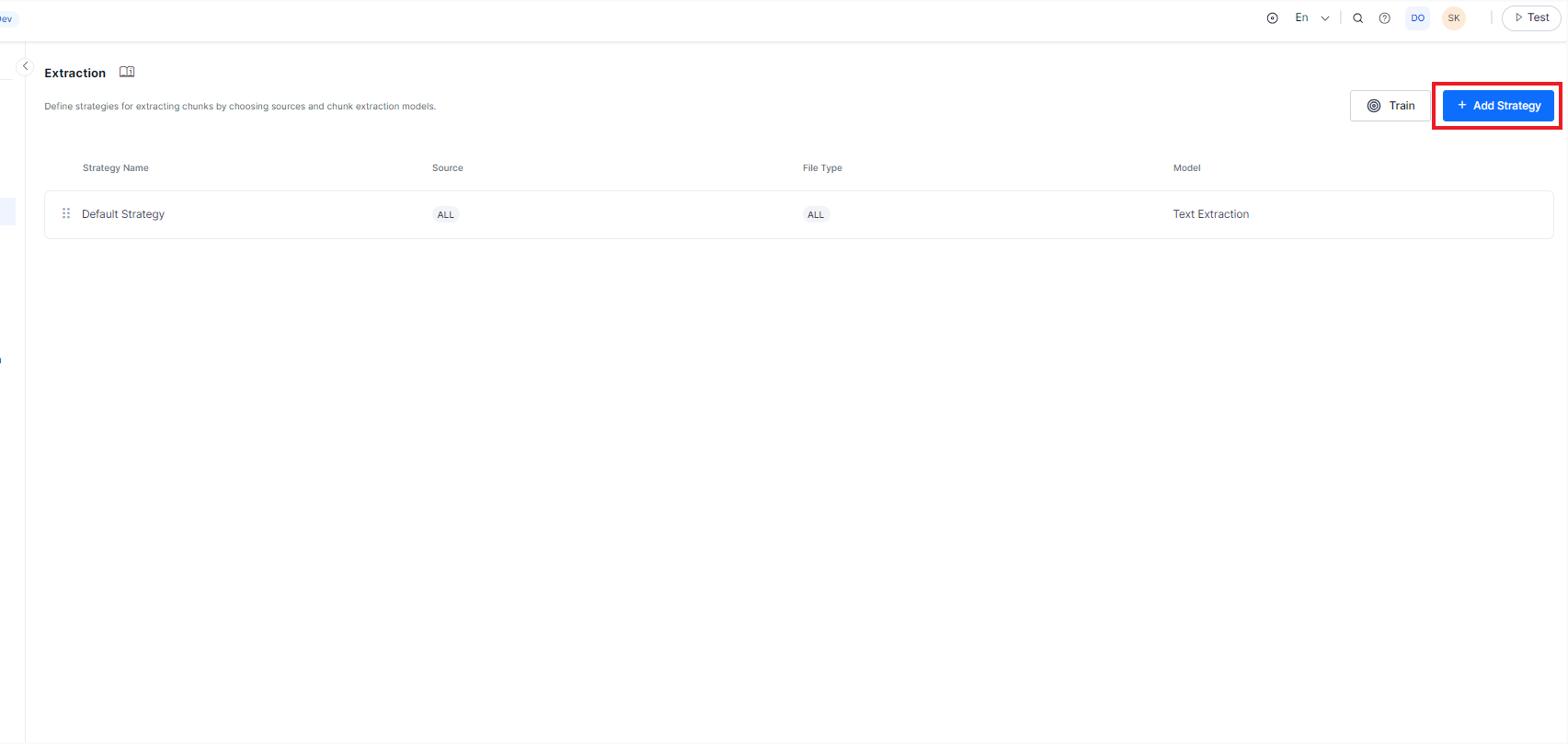 To add a new extraction strategy, click on the +Add Strategy button.