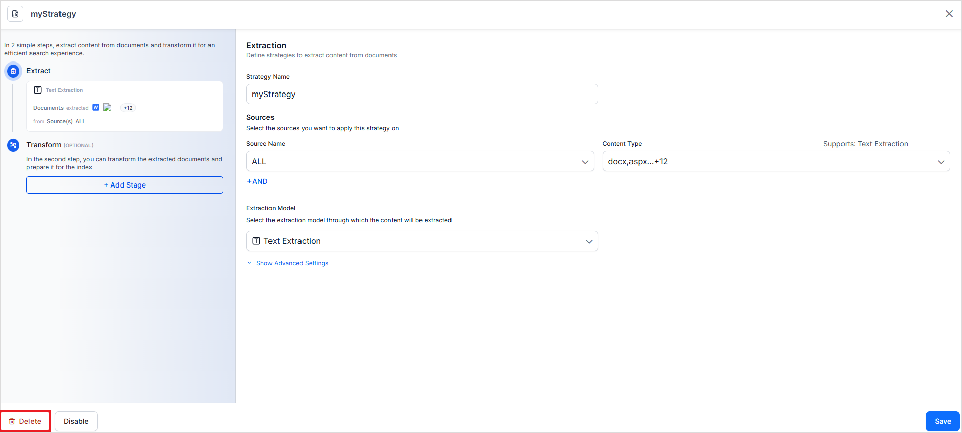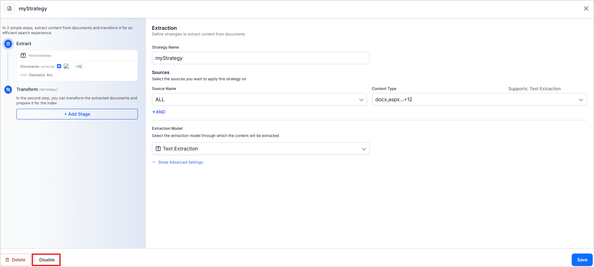 By default, as soon as a strategy is created, it's enabled. You can also temporarily disable a strategy for testing purposes to evaluate alternative extraction strategies or when it's no longer needed. You can do so from the strategy page.