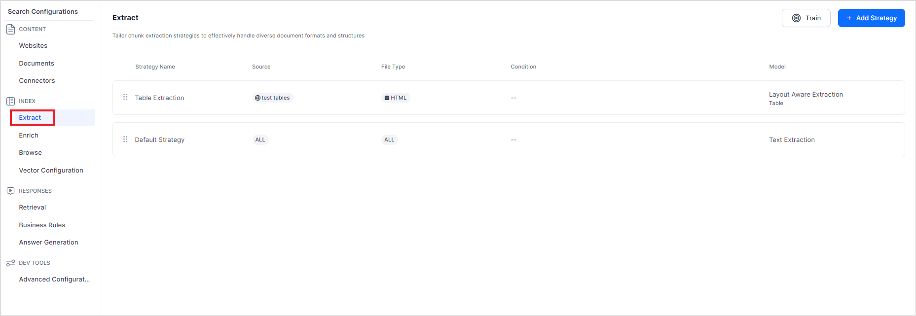 To view the strategies defined in an application or to make any changes, go to the Extract page under the Index tab.