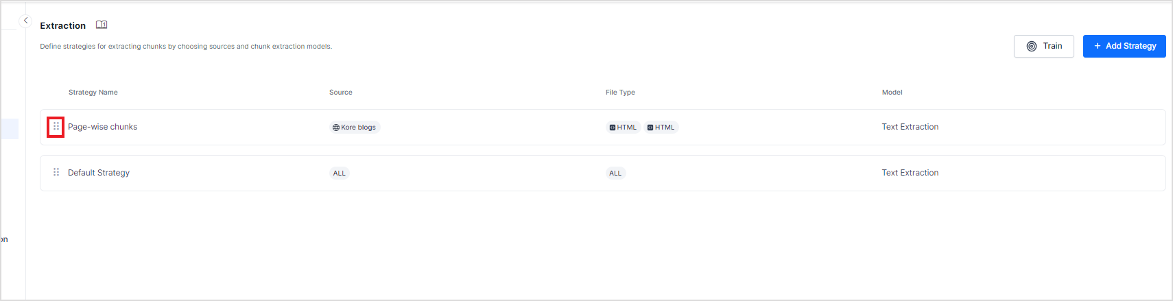 When more than one strategy is defined in a given application, the strategies are applied to the data based on their priority or sequence in the list. For example, if two strategies are defined - one for the web pages and the other one (default strategy) that applies to all types of content, the sequence decides the strategy to be used for a given content type. If the default strategy is at the top, it will extract chunks from all the sources, and the other strategy won't be used. If, on the other hand, the strategy for web pages is on top, it will be applied first and extract the chunks from the web pages, followed by the extraction of chunks from all other sources using the default extraction strategy.