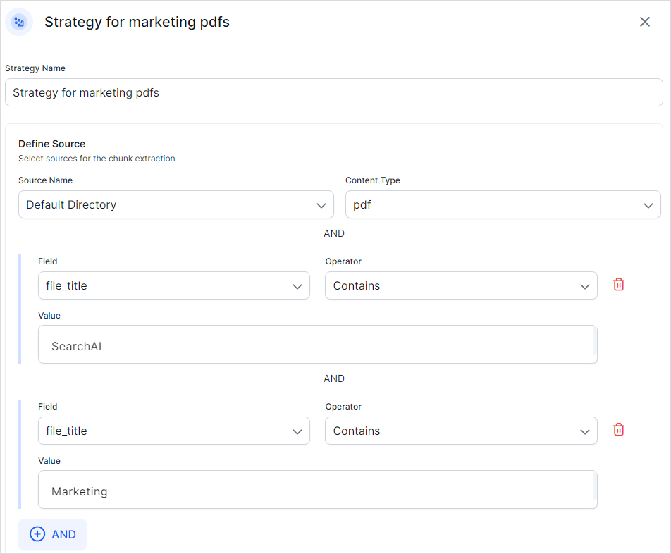 You can also use the logical AND operator to apply multiple rules to filter the data on which a particular extraction strategy is to be applied. For instance, to select all the SearchAI marketing material (assuming, available as PDF files in a given directory), you can define the source as shown below.