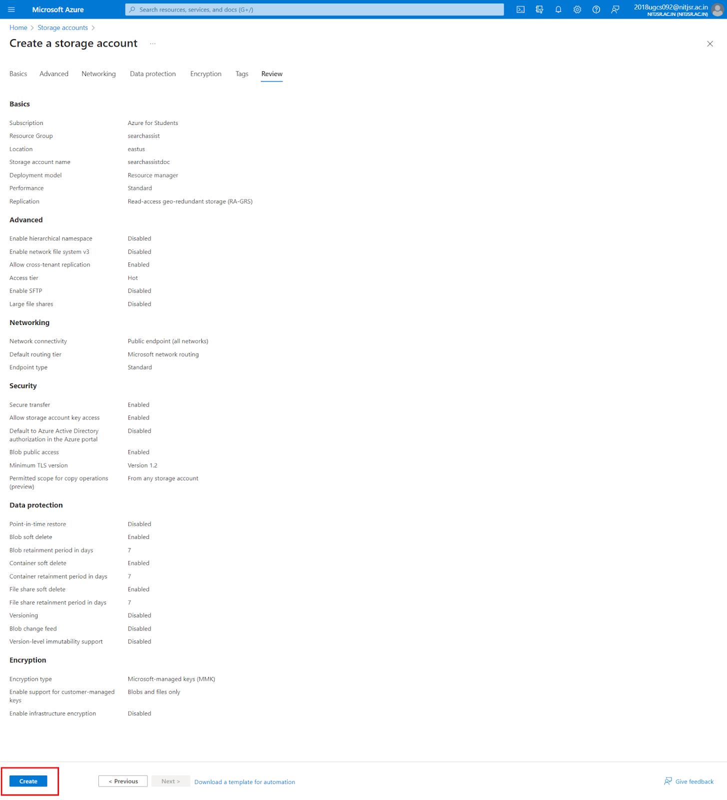 Click on Create to create a new storage account.