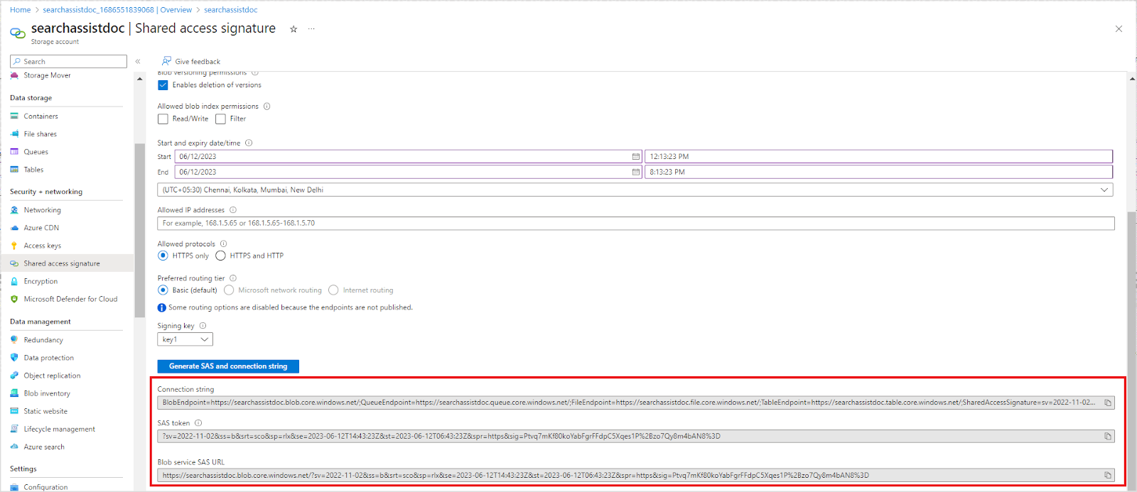 This will generate the connection string, SAS token, and blob service SAS URL. Save these fields to configure the Azure connector in Search AI.