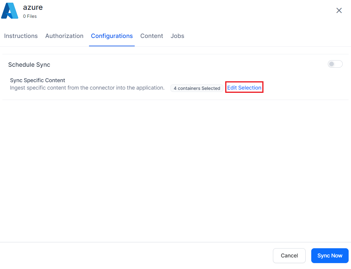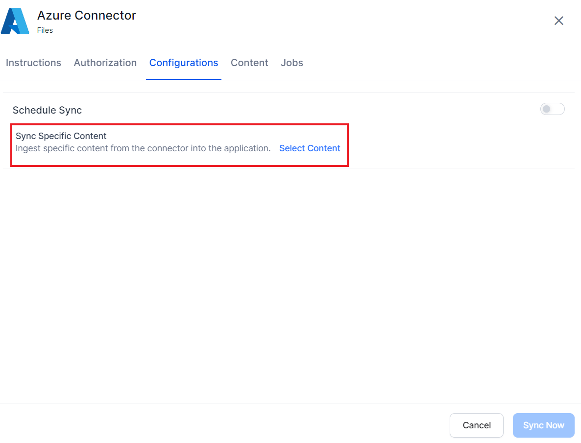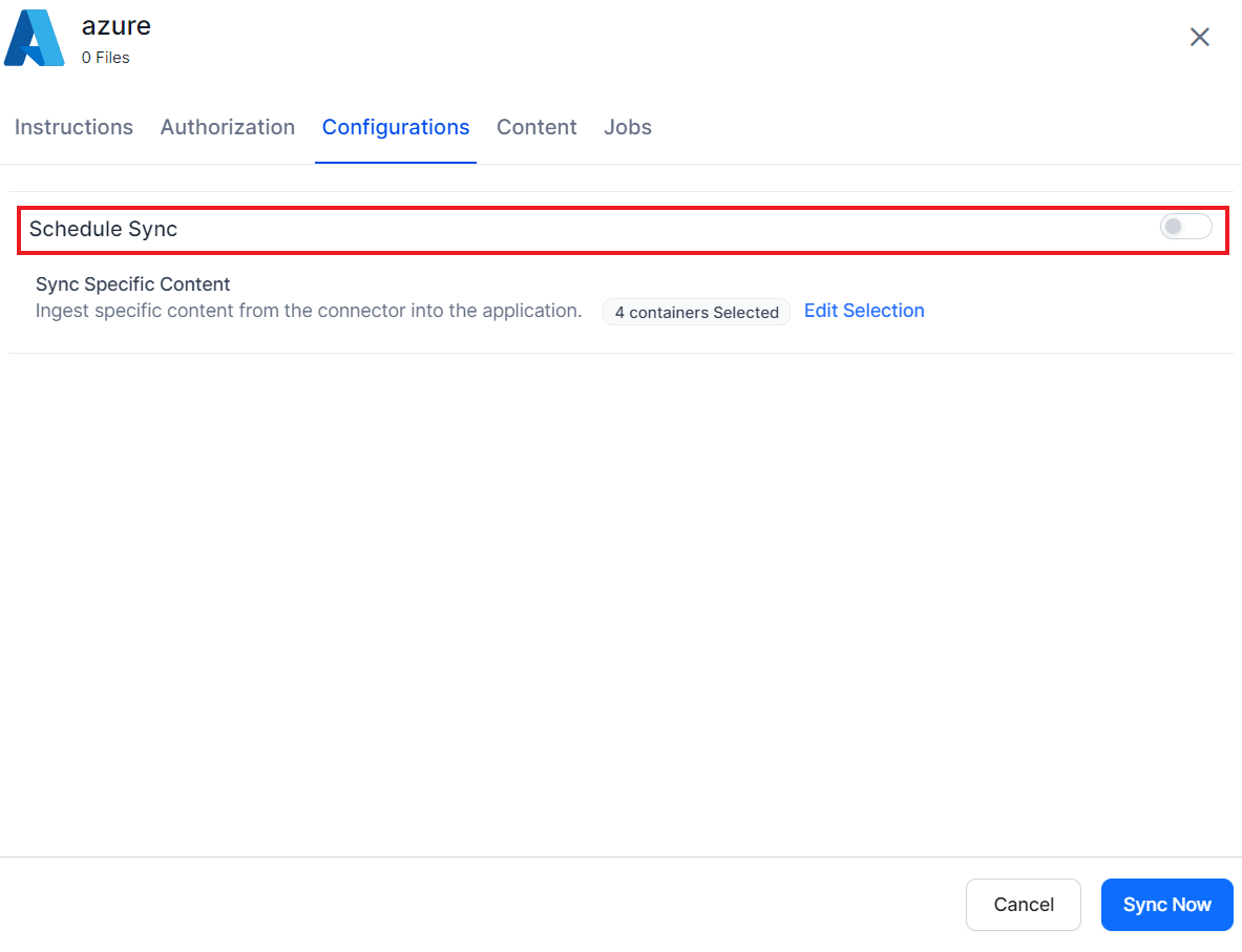 To synchronize the content, go to the Configurations tab. The synchronization allows ingestion of the intended content from the Azure Storage account to the SearchAI application. You can either set up automatic synchronization or trigger a manual sync. To initiate a sync manually, click on the Sync Now button at the end of the page.