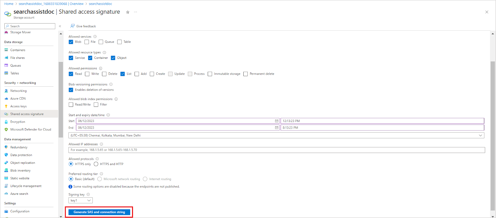 From the left navigation menu, go to Shared access signature and generate a SAS key. To do so, enable the following settings and click on Generate SAS and connection string button at the bottom.