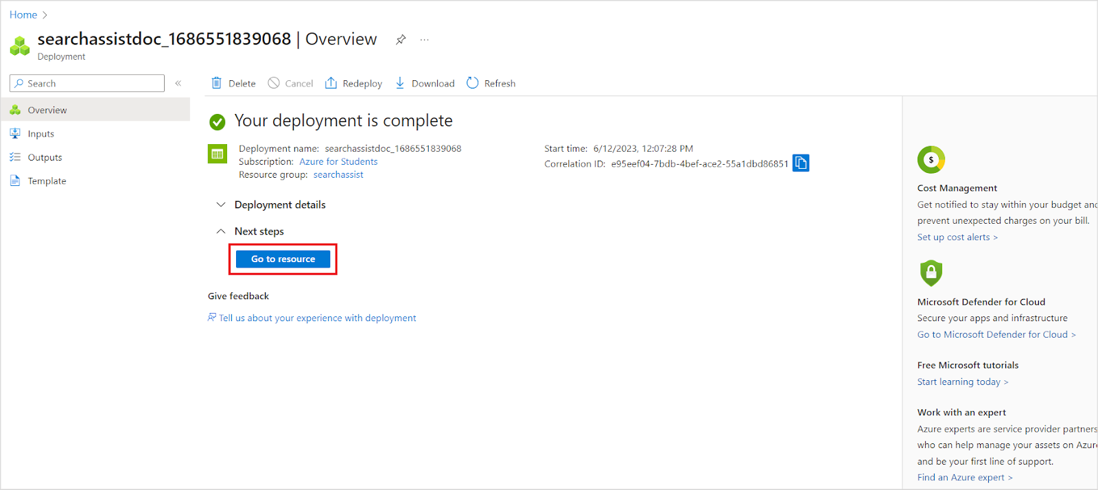 After the creation and deployment of the account are complete, click on Go to resource.