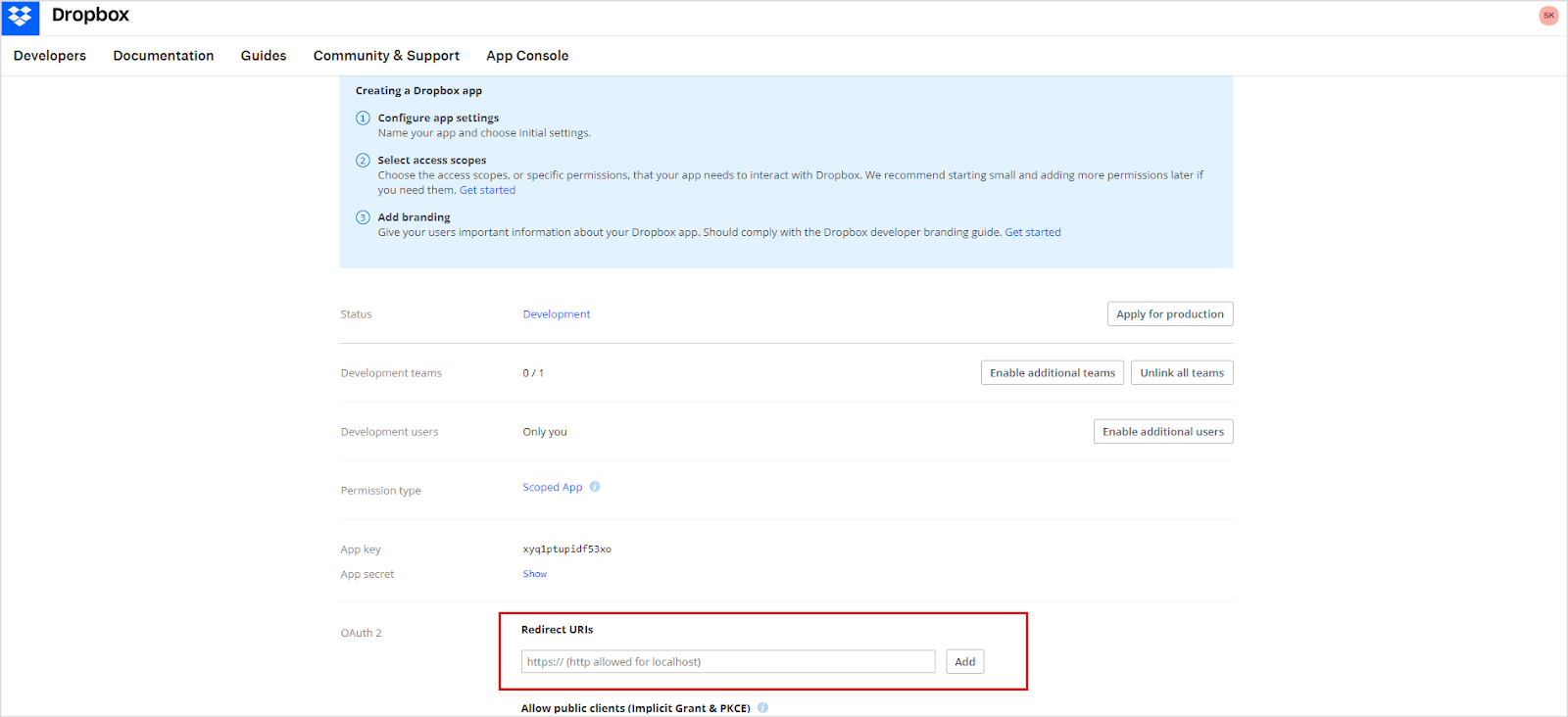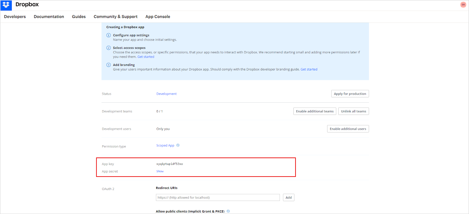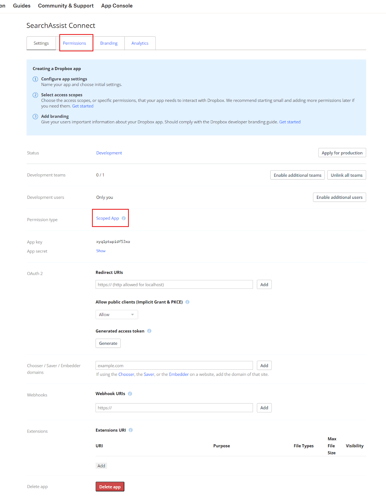 Save the App key and App secret displayed on this page. These credentials are required for the configuration of the Dropbox connector in the Search AI application.