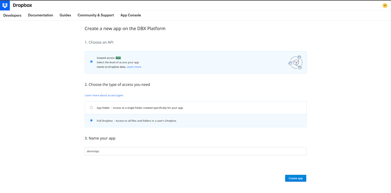 To create an application in the Dropbox account, sign in to the Dropbox Developer Portal. Create a new app. On the Create app widget, under Choose an API, select Scoped access and select the type of access you need.