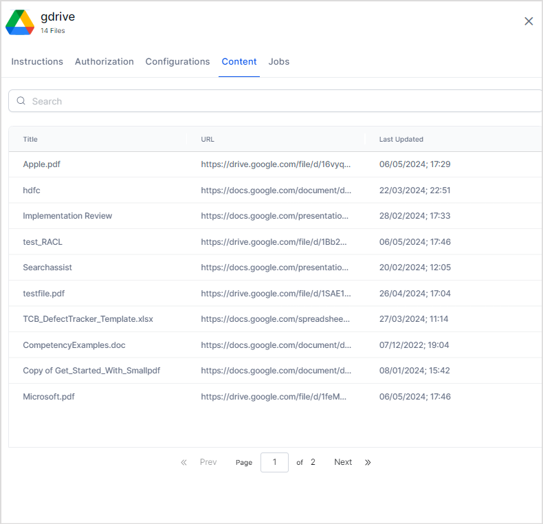 - Once the connection is successfully established, to synchronize the content at any time, go to the Configurations tab and click Sync Now. Go to the Content tab to view the content ingested into the application.