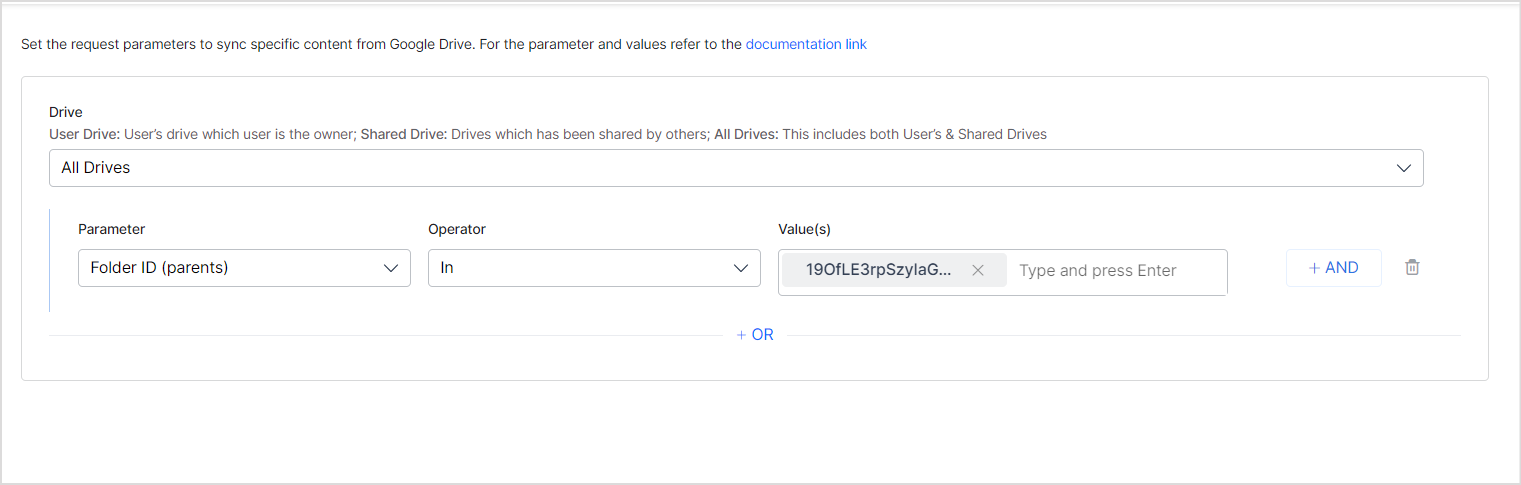 - Shared Drive includes only the locations shared with the account for which the Google Drive connector is configured.