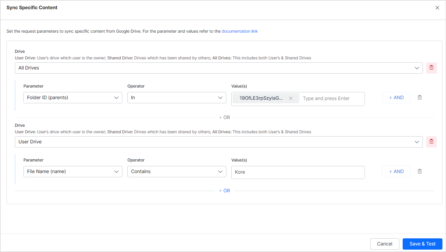 - Sync Specific Content - This option allows you to select the content to be ingested into the SearchAI application. Click on the Configure option. The following widget allows you to set up rules for filtering content. Set up rules and click Save and Test.