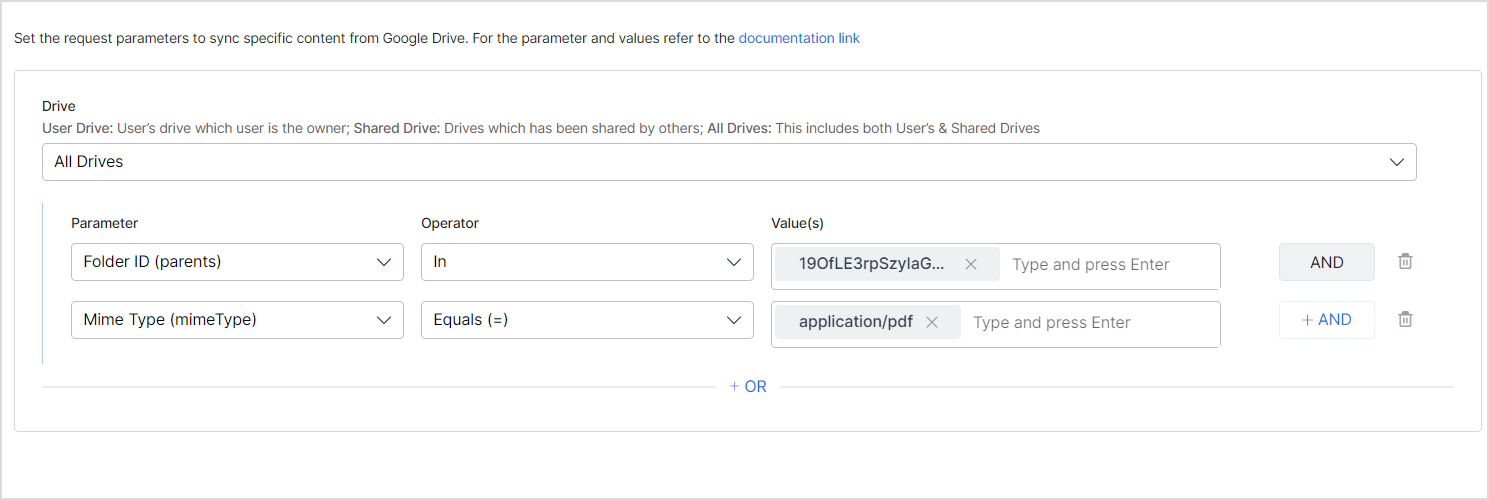 - You can define more than one condition to a rule to filter specific content. For example, to ingest only PDF files from a given folder, you can set up a filter as: