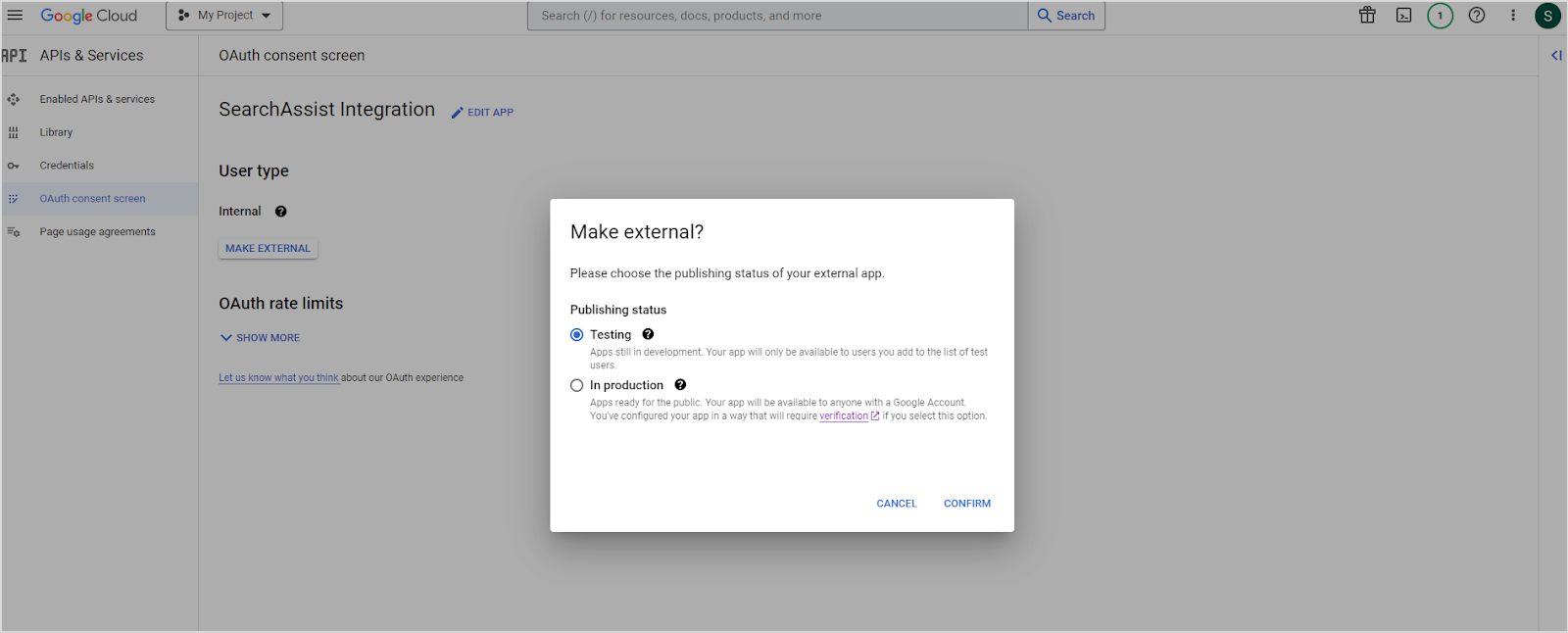 - While you are still in development or testing mode, you can set the publishing status of the application to Testing. In testing mode, only the users added can access the application while in production mode, the application is available publicly to everyone with a Google account.