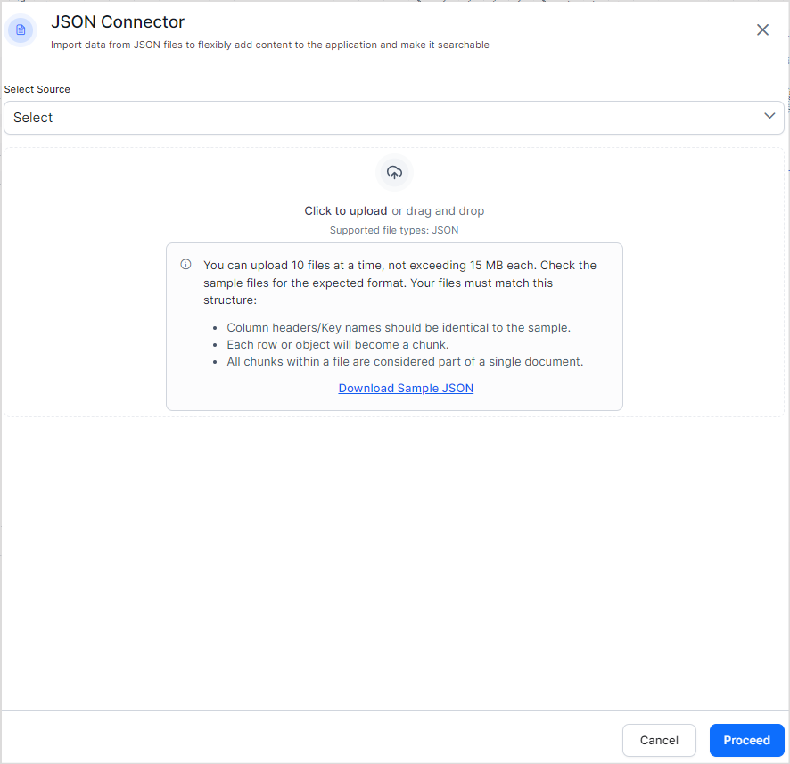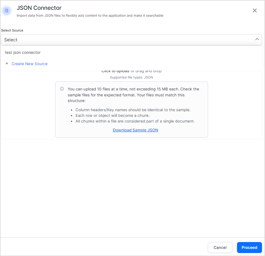 Select the source name to which the JSON content is to be uploaded. If there is no existing source, create a new source. Upload the file with the structured data in JSON format. Use the sample file as a reference for the JSON file format.