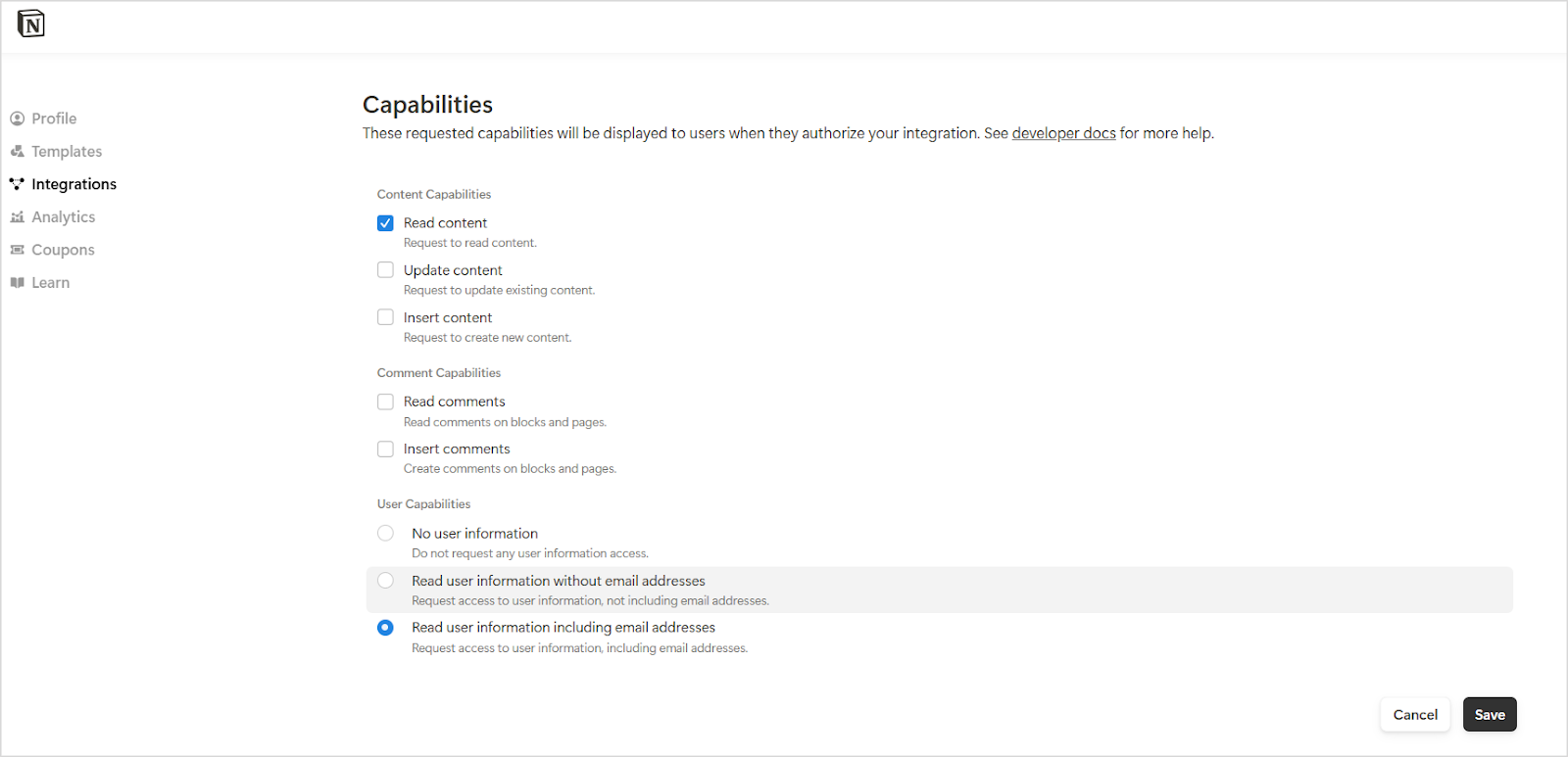 - While creating an internal integration, ensure that the following capabilities are enabled under the Configuration tab of the integration.