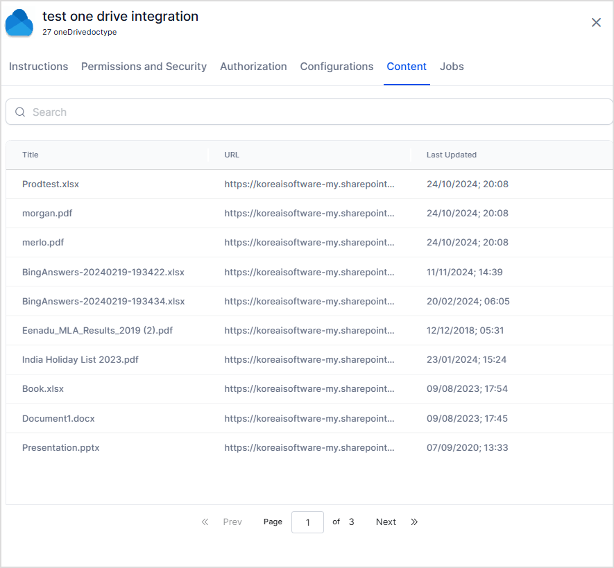 The following screenshot shows content ingested after a sync operation through the OneDrive connector: