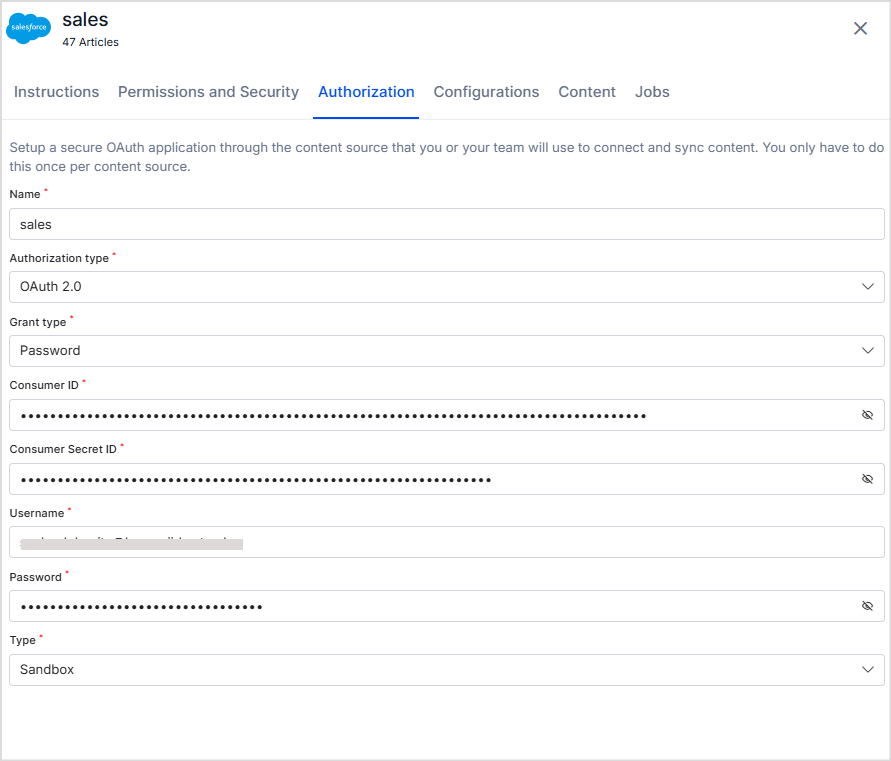 The next step is to configure the Salesforce connector in SearchAI. Go to the Connectors tab under Sources and select Salesforce from the list of available connectors. On the Authorization tab, enter a name for the connector, provide the Consumer ID and Consumer Secret Key, generated in the previous section, select the type of source, and click Connect. The field Type can take the following values: