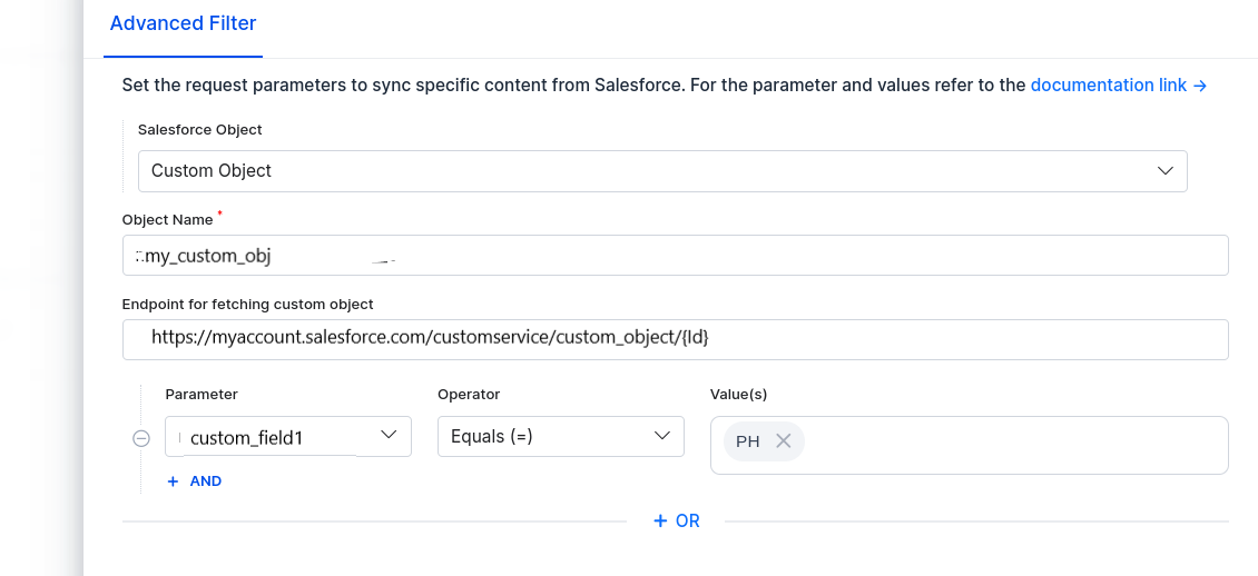 - Apply Filters (Optional) – You can define parameters and values to filter and ingest only specific custom objects. Use the Add button to add a particular parameter and its values. The parameter name should exactly match the field names of the custom object in the Salesforce application.