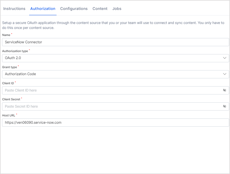 - Authorization Type: Search AI supports two types of authentication: Basic and OAuth 2.0.