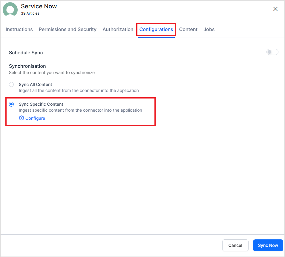- After the connection is established, go to Configurations tab and click Sync Now to ingest content.