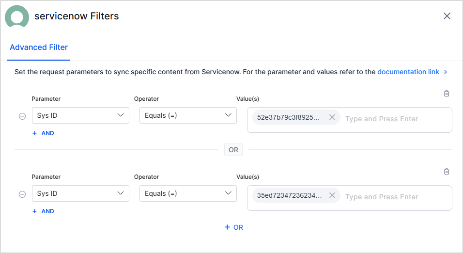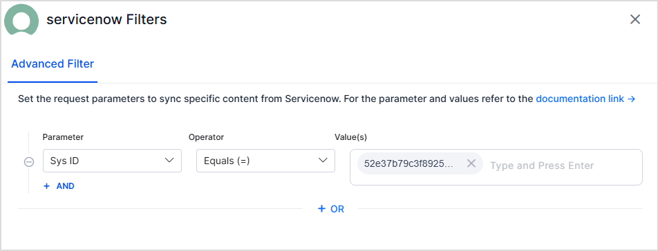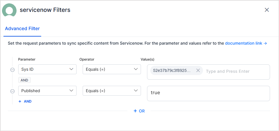 For instance, to ingest articles with a given sys ID, use the filter as shown below: