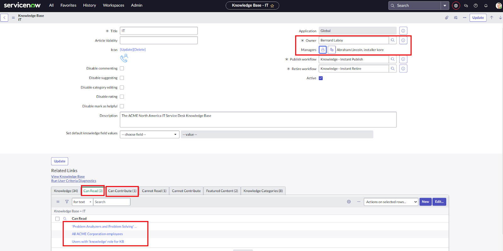 In ServiceNow, user access to knowledge base articles can be defined in three ways: