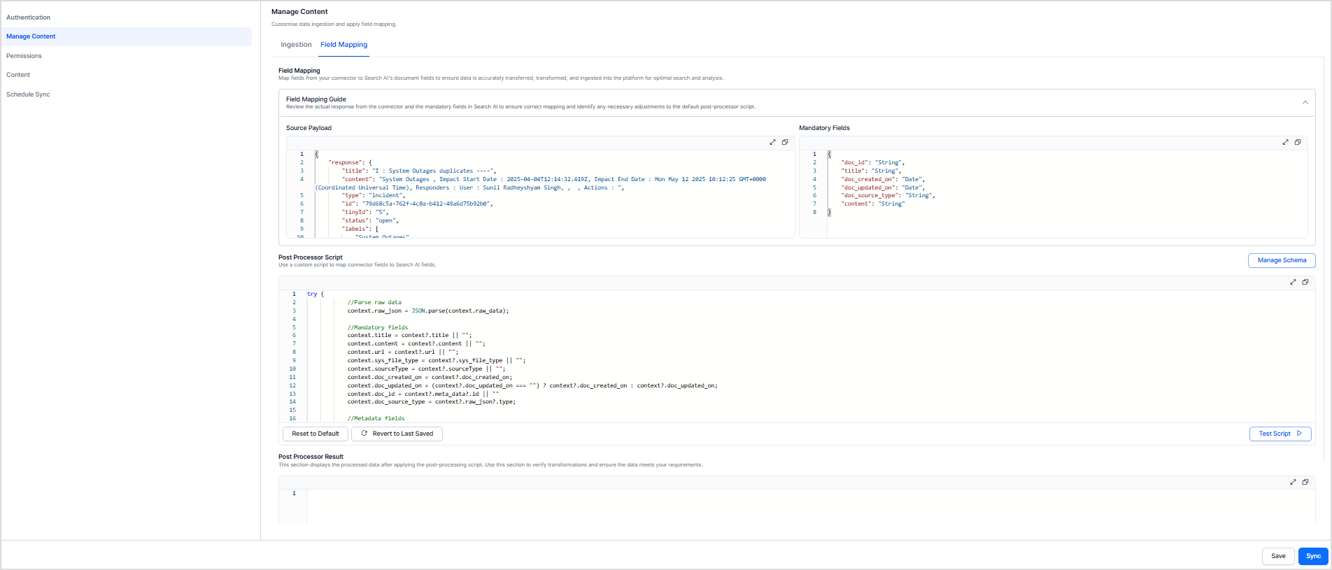 - The source payload shows the actual response from the connector. The mandatory fields required by Search AI are listed on the right pane.