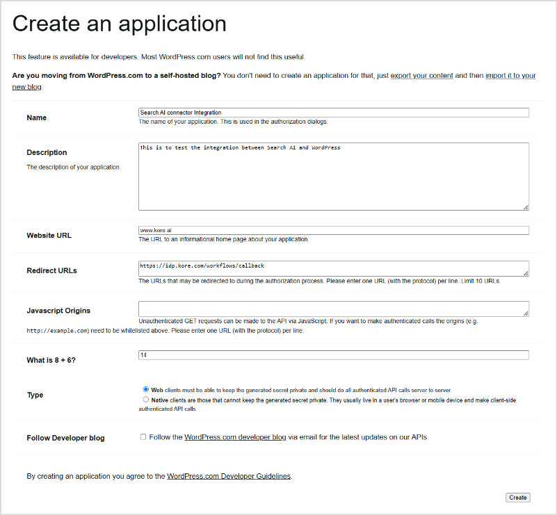 - Authorization Type - If the WordPress site is publicly accessible, set this to public. If it's a private site, set this to OAuth 2.0 and additionally provide the client credentials to set up communication with the site.