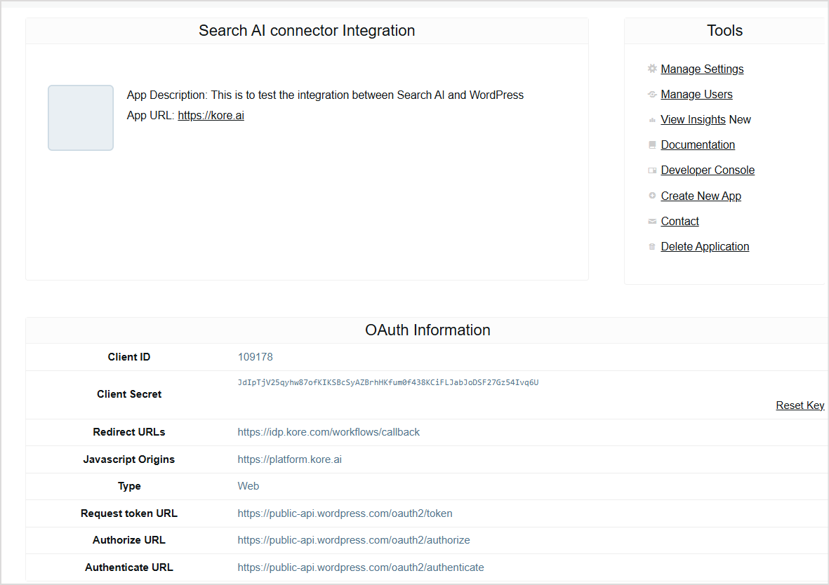 - The following page displays the Client credentials along with other details of the app. Copy and keep them secure. These credentials are required for configuration in the Search AI connector.