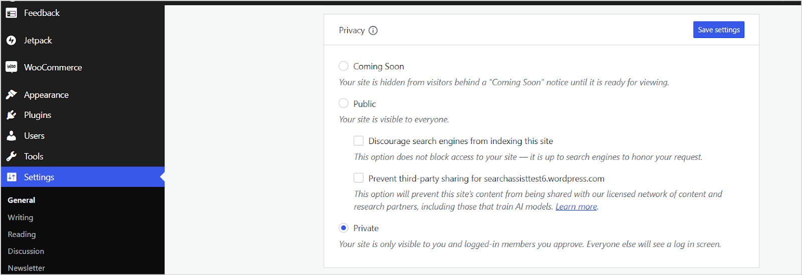 - When a private site is granted public access in Search AI, it is also available to all the users of Search AI, irrespective of the access granted in WordPress.