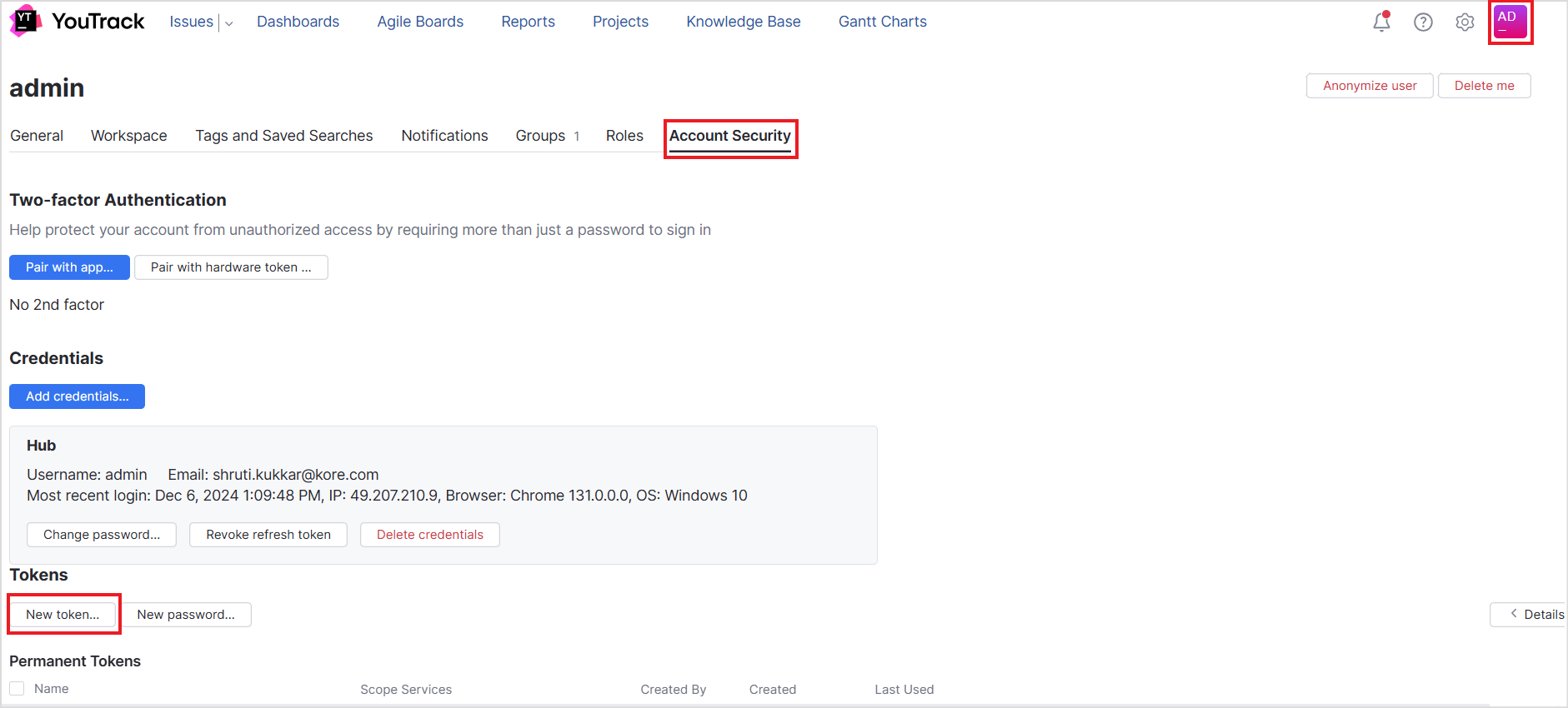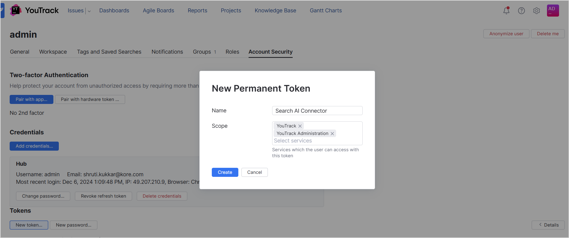 YouTrack connector interacts with YouTrack via the REST APIs. To enable this communication, Search AI uses a Permanent Token Authorization. Follow the steps listed below to generate this token on YouTrack.