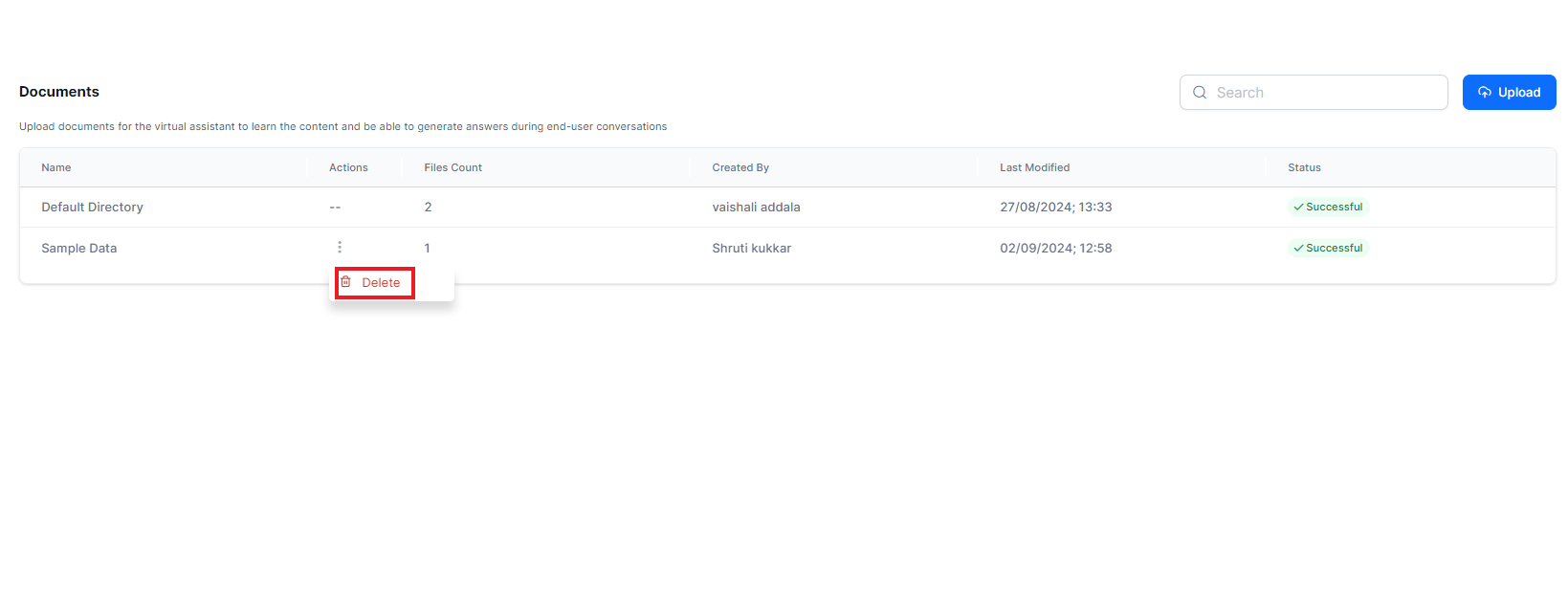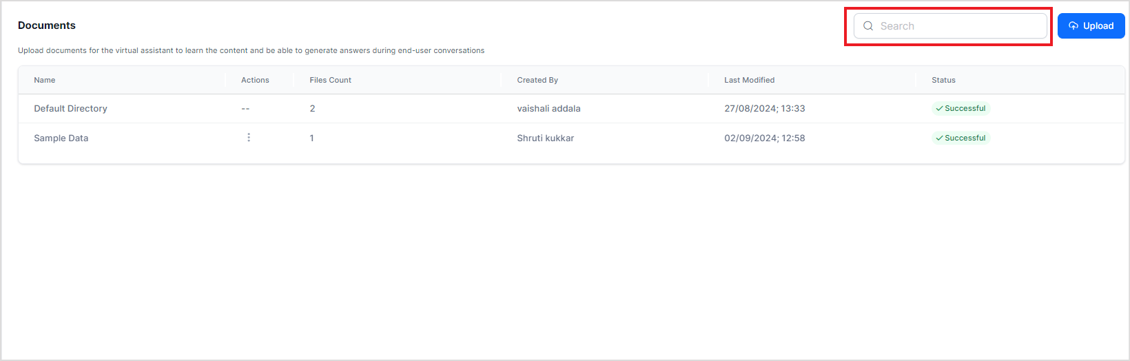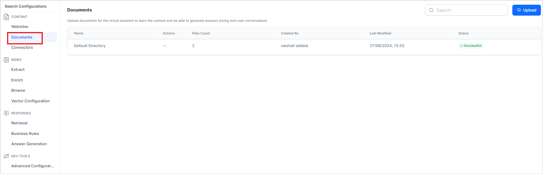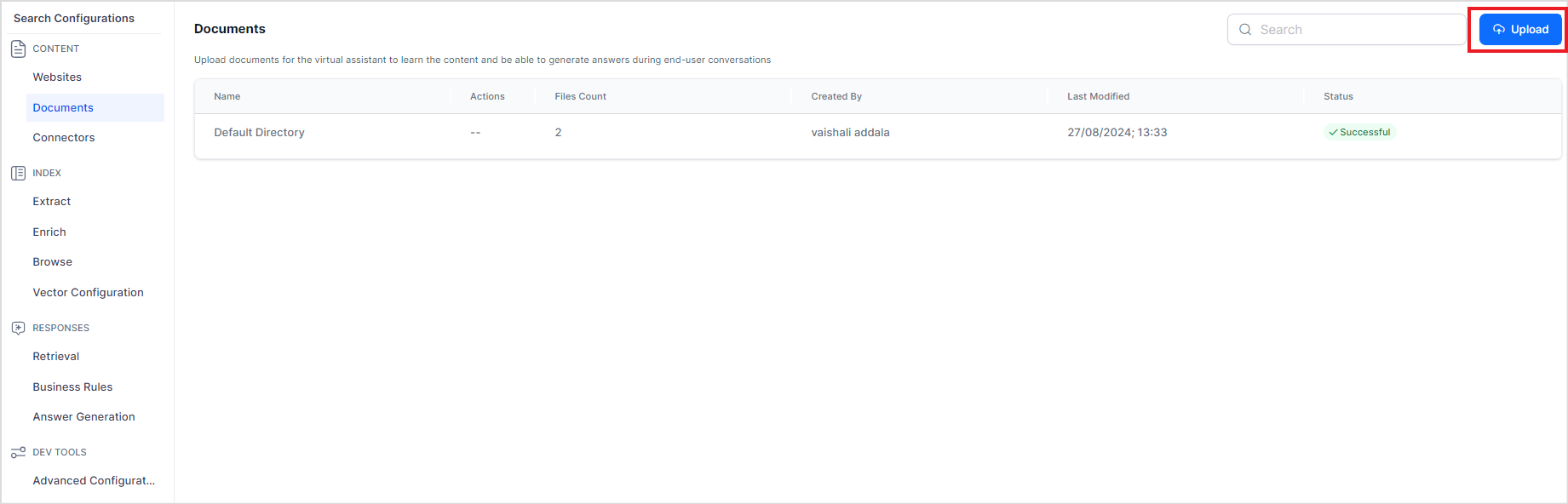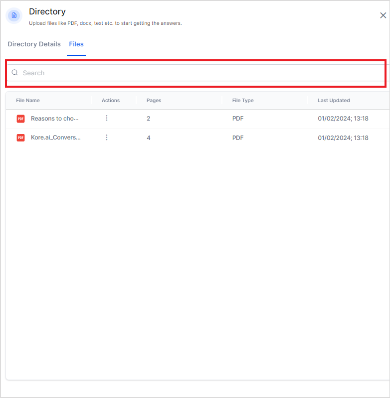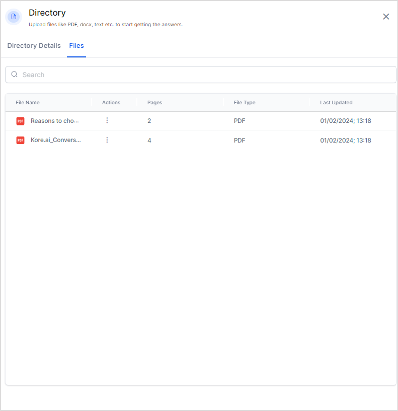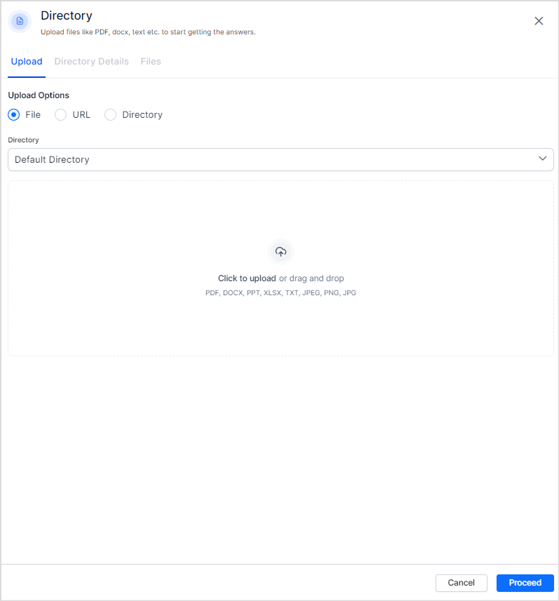 Search AI allows you to upload one or more files or directories from the local device or a given URL. The uploaded files are organized into directories in the application. A default directory is always present to store files. Once a file is successfully uploaded to the application, it is automatically indexed, and the file data is readily available to answer user queries.