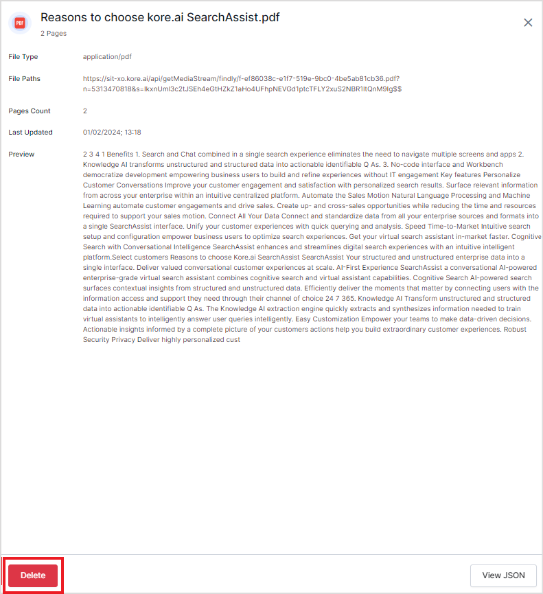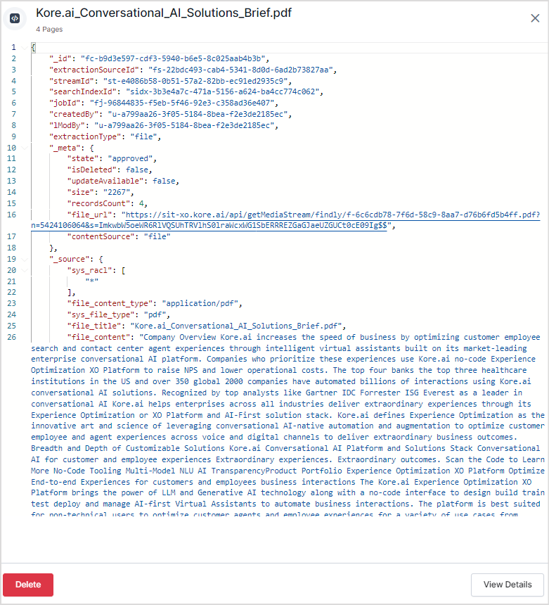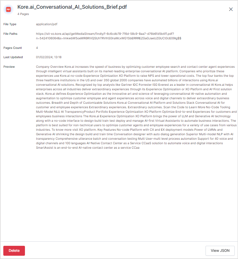 Click the JSON view button to see the file details extracted from the file in JSON format.