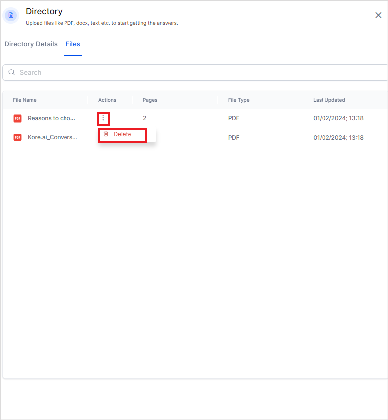 To delete a specific file from a directory, go to the Directory Details and select the Delete action corresponding to the file to be deleted.