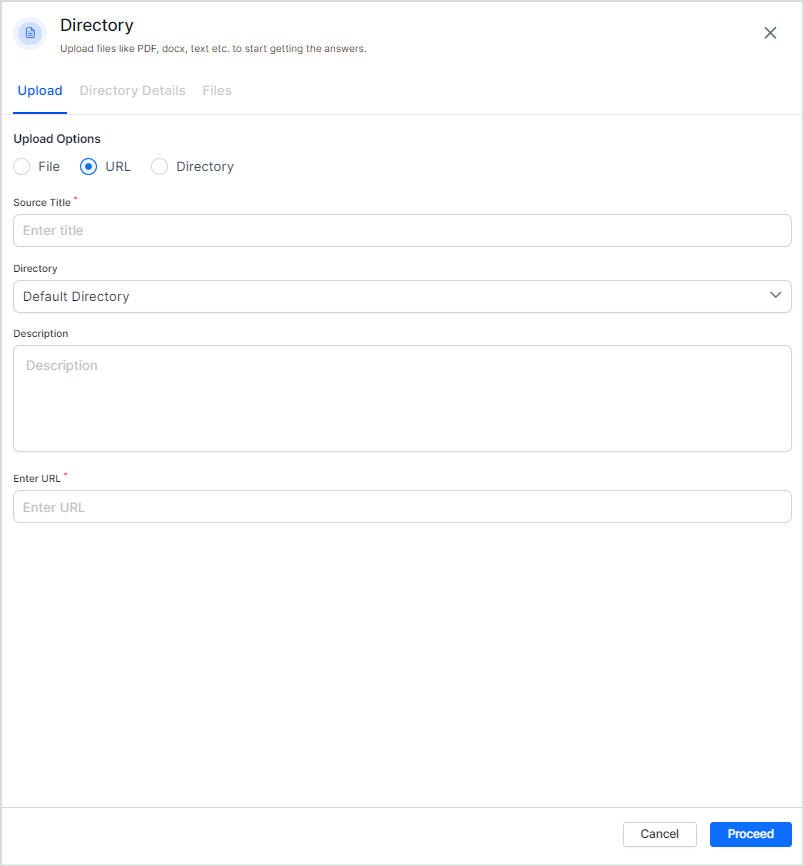 URL: Use this option to upload a file hosted remotely via its URL. Enter a title for the file to be uploaded from the URL, select the directory to which it is to be uploaded, enter the description for the file, the URL where it is located, and click Proceed.