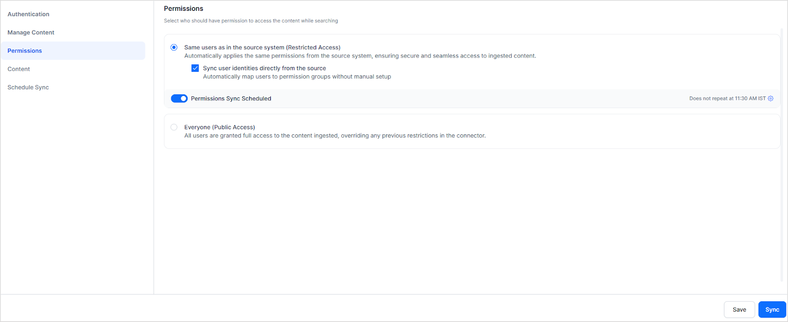 When you enable RACL, that is, changing the access from Public Access to Restricted access, manually initiate a sync from the connector. This ensures the connector fetches and indexes the latest permission data. If you schedule an automatic sync with the connector for a future time, the updated permissions take effect after the next sync activity.