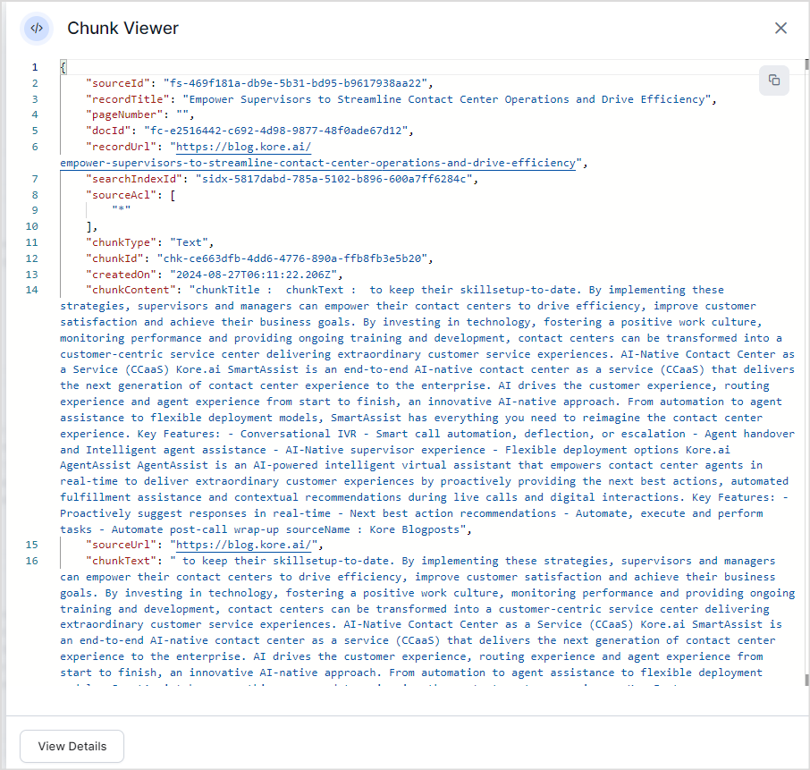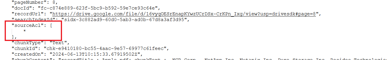 To view and verify the user permissions in the ingested content, go to the Content page and open the JSON view corresponding to the file, and verify the contents of the sys_racl field. The same information is also available in individual chunks created from the ingested content. Verify the sys_racl field for a chunk in the Chunk Viewer.