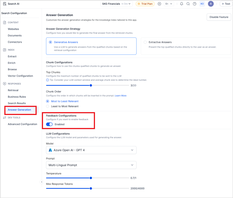 To enable the feedback mechanism in answers displayed in the web SDK, go to the Answer Generation page and enable the Feedback Configuration.