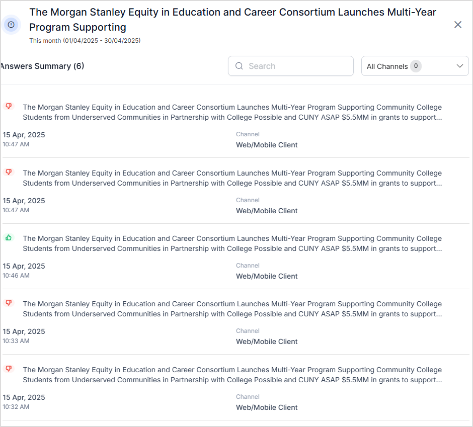 This data is then shown in the Answer Insights page, providing administrators and content teams with a clear view of how well responses are resonating with users.
