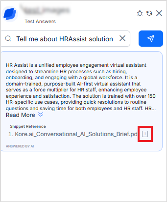 Test the answers. Go to the Answer Generation page and use the Test Answer widget to verify the results. When queries are made against indexed images, the text extracted from the image is included in the generated answer. The complete image can be viewed by clicking the Preview icon next to the references.