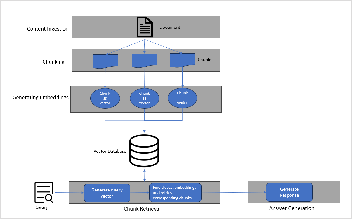 - Answer Generation: Involves generating a response to the user query based on the retrieved chunks.