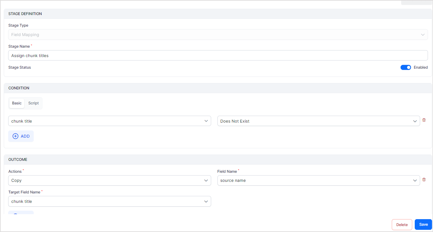 The Field Mapping stage allows you to transform and manage fields within a chunk and map them to target fields in the Answer Index. Fields refer to the Chunk Fields that store the source content in the Answer Index. These fields are like the schema of a database. Use this stage to modify field values, restructure data, or apply business-specific rules before indexing. Field Mapping also supports conditional logic, enabling you to apply transformations only when defined conditions are met.