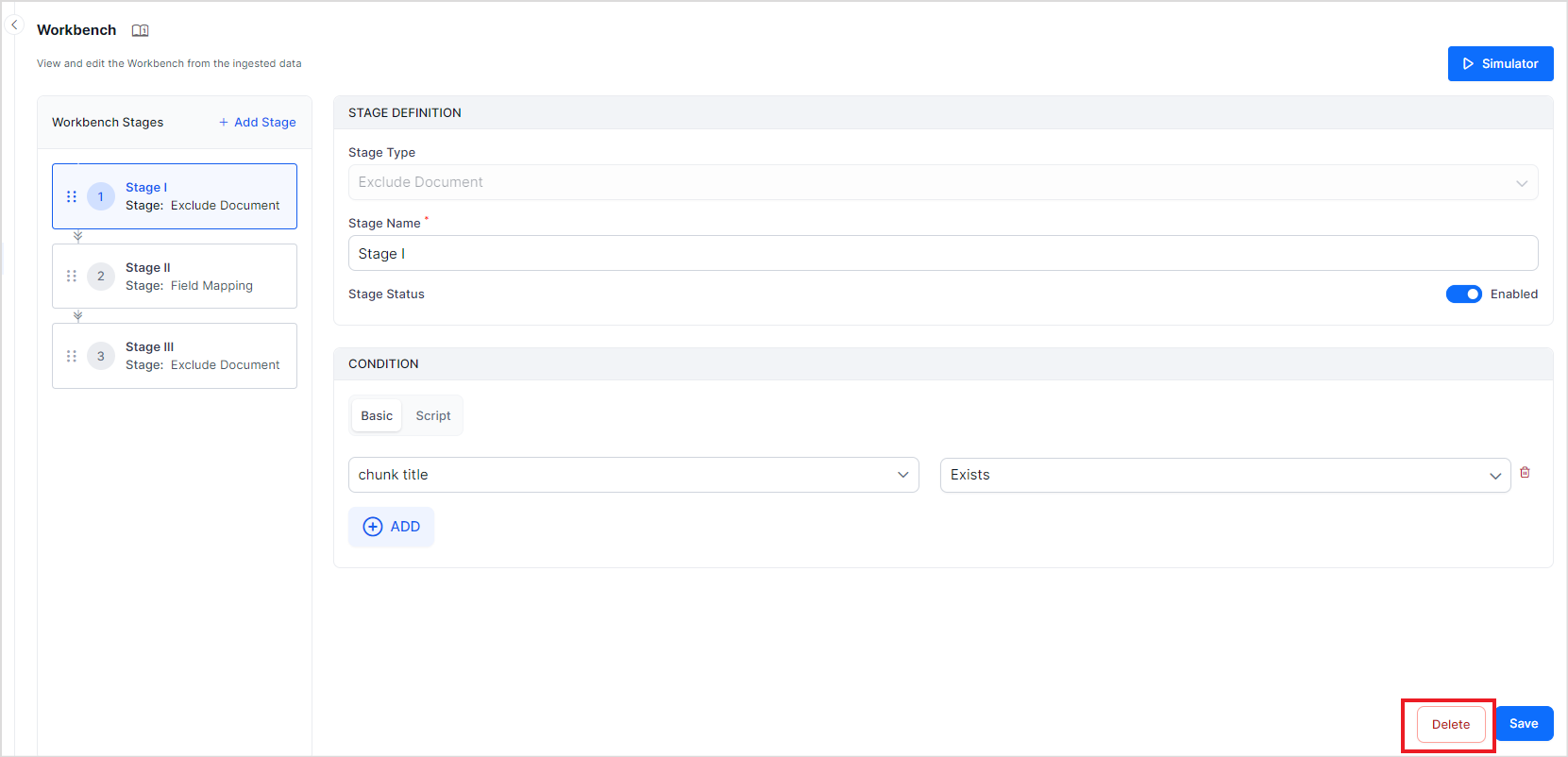 Deleting a stage removes it permanently from the Workbench. Use the Delete button at the bottom of the page to delete the stage.