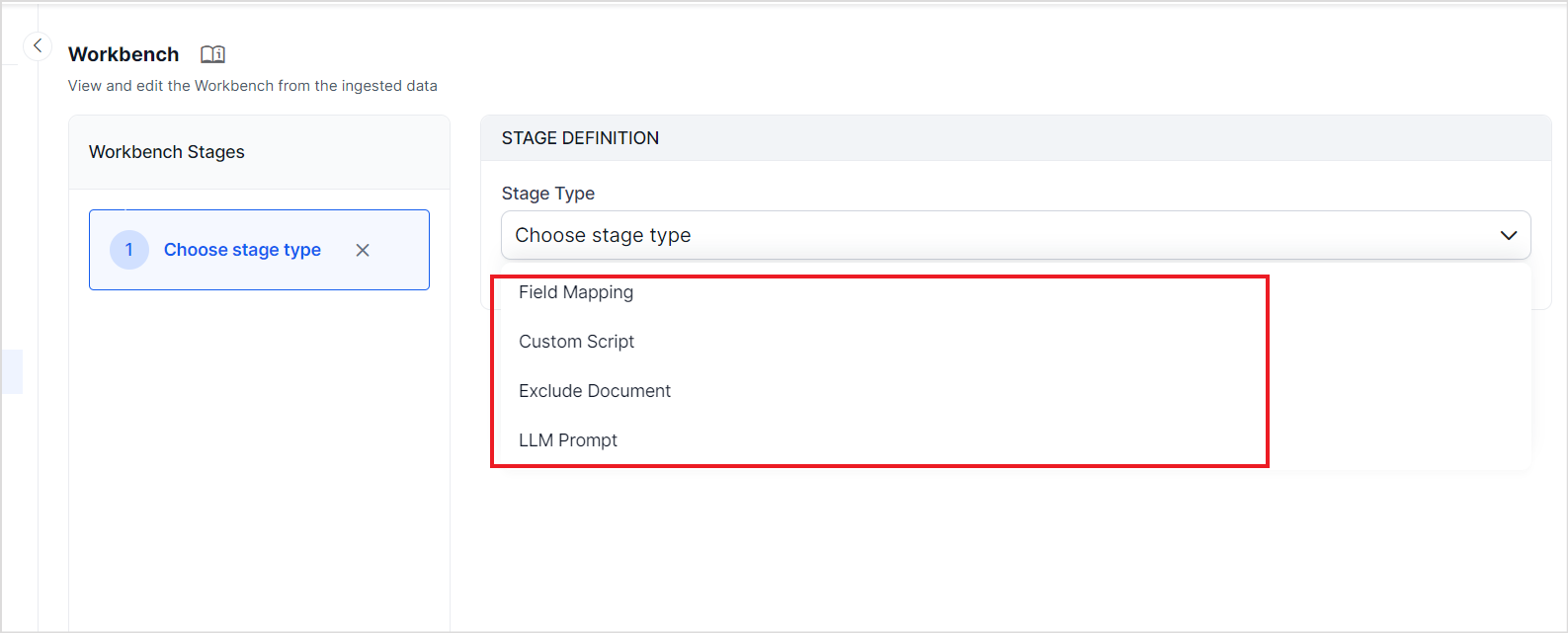 Workbench is a tool that allows you to process and enhance the ingested content. Workbench transforms data through a series of steps called Stages. You can use Workbench to update content, add metadata, clean data to exclude certain pages, etc. By improving the quality of your content, you can enhance the accuracy of answers and thereby, the search experience. For example, if you don't want confidential information to appear in the answers, you can set up an exclude document stage that excludes chunks containing the word ‘Confidential’ in the title or the body of the chunk.